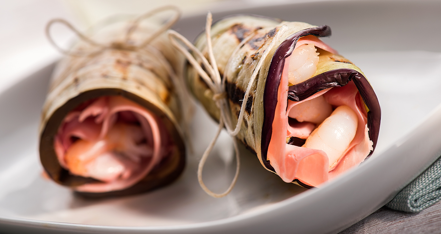 7. On each slice of aubergine, put one slice of cooked ham, some fiordilatte strips and at least 3 shrimps.