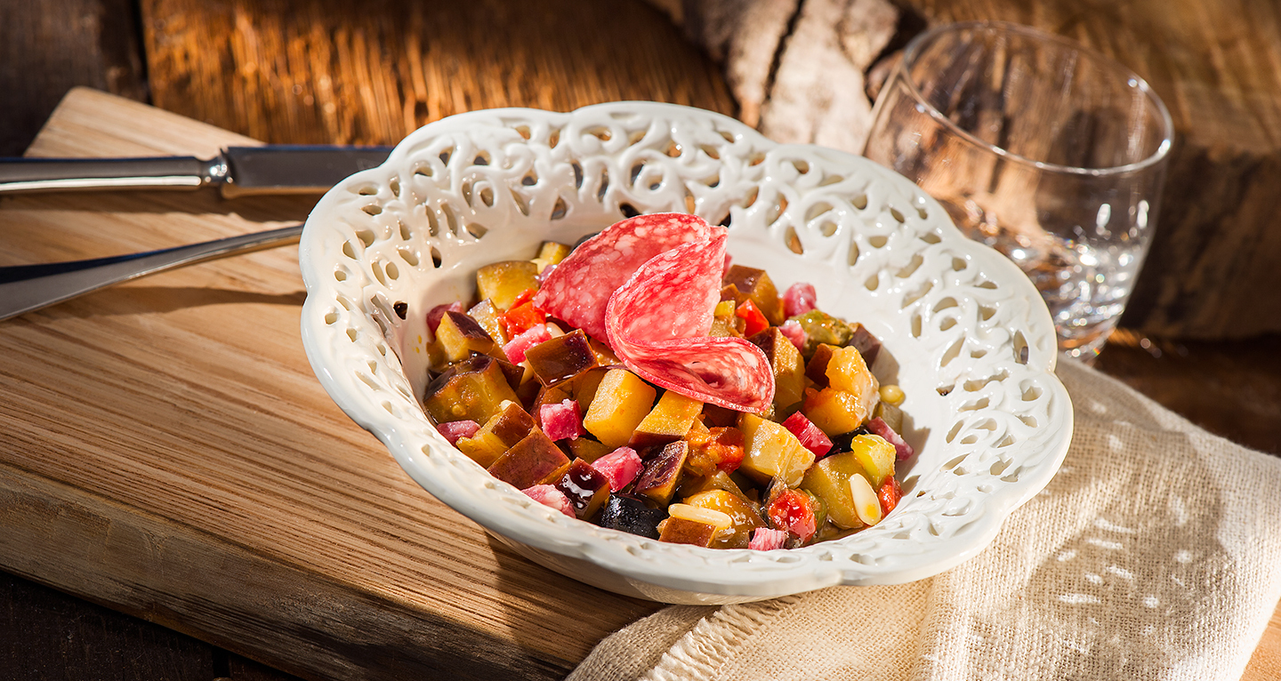 1. Enrich the classical aubergine caponata with salami cubes and complete the dish with Milan salami arranged in the shape of roses.
