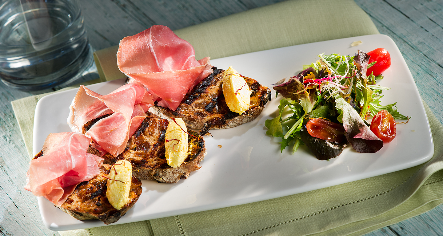 Bruschetta of raisin bread, San Daniele ham and saffron goat cheese