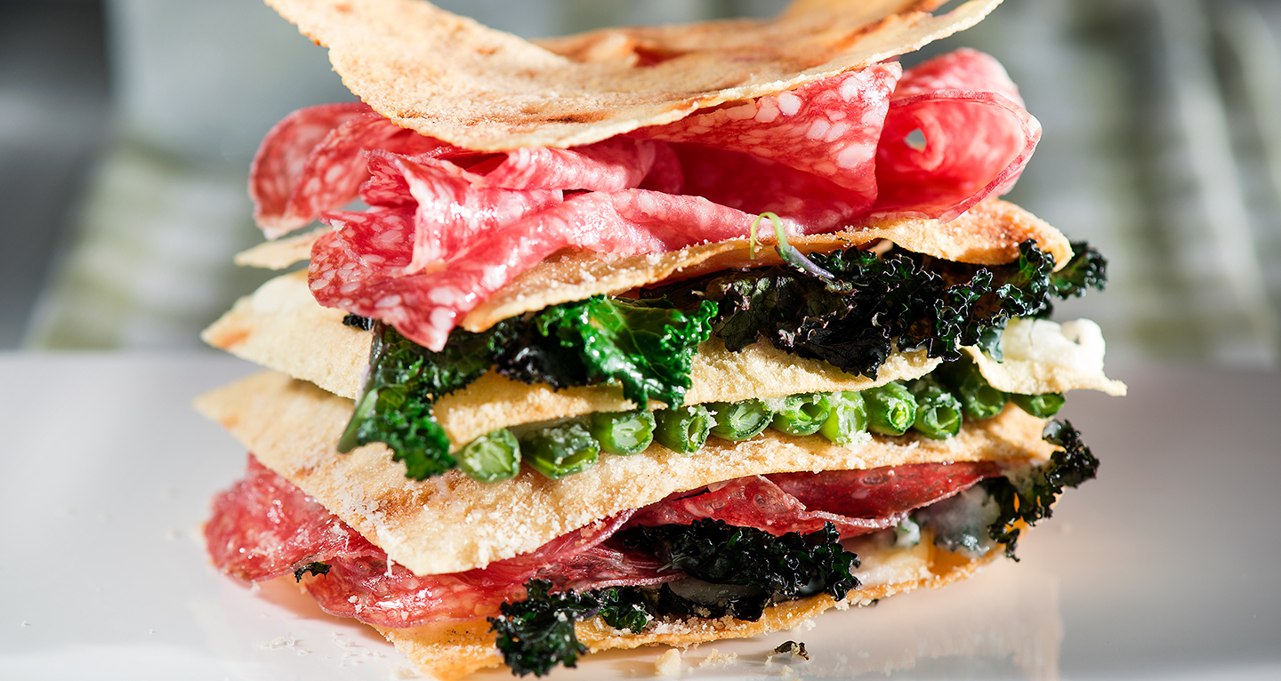 2. Alternate Pane Carasau with salami, turnip greens and green beans, topping each layer with parmesan and pepper. Cook au gratin in the oven.