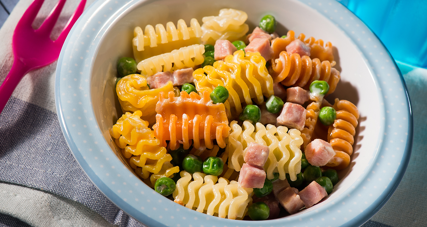 Coloured pasta with ham cubes and peas