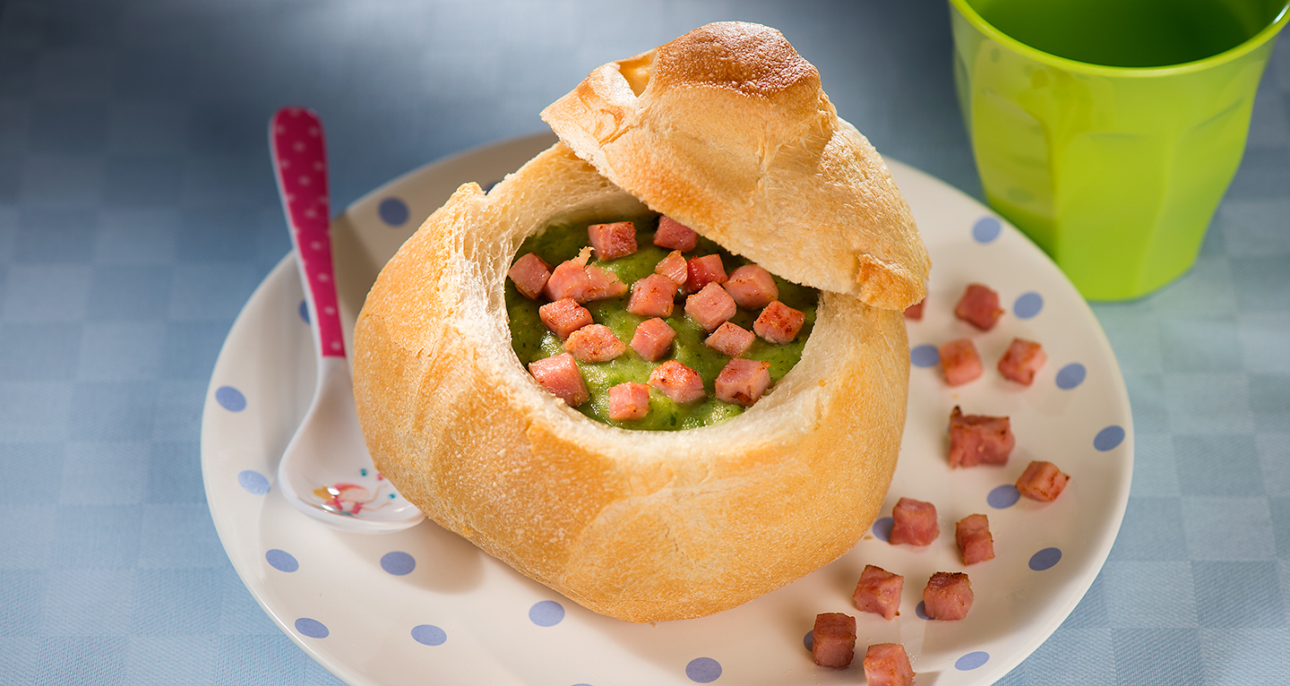 Courgette purée in bread with cooked ham cubes