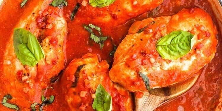 4. Once it is simmering, add the browned chicken breasts back into the sauce and cover with lid. Let simmer for 15 minutes. Chicken should be fully cooked through (165 internal temp)