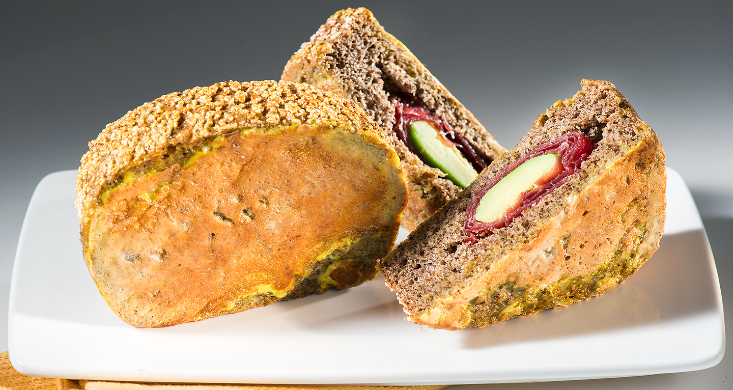 Mango-flavoured buckwheat eggy bread stuffed with bresaola and avocado