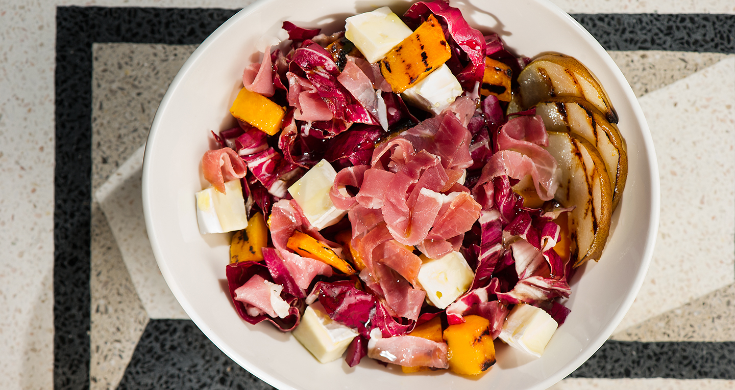 Salad with radicchio, grilled pumpkin and pears, brie cheese and Parma ham