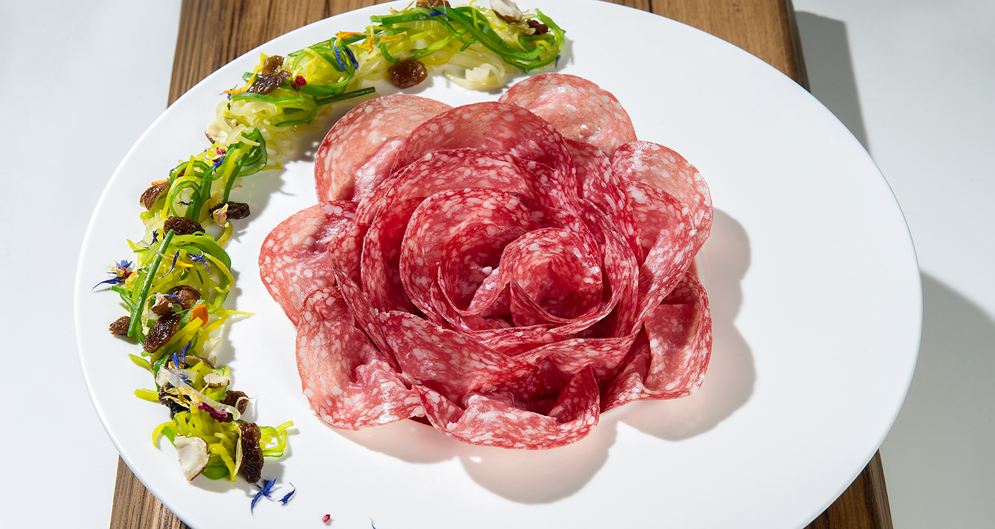 Salami, stewed leeks with raisins and toasted hazelnuts
