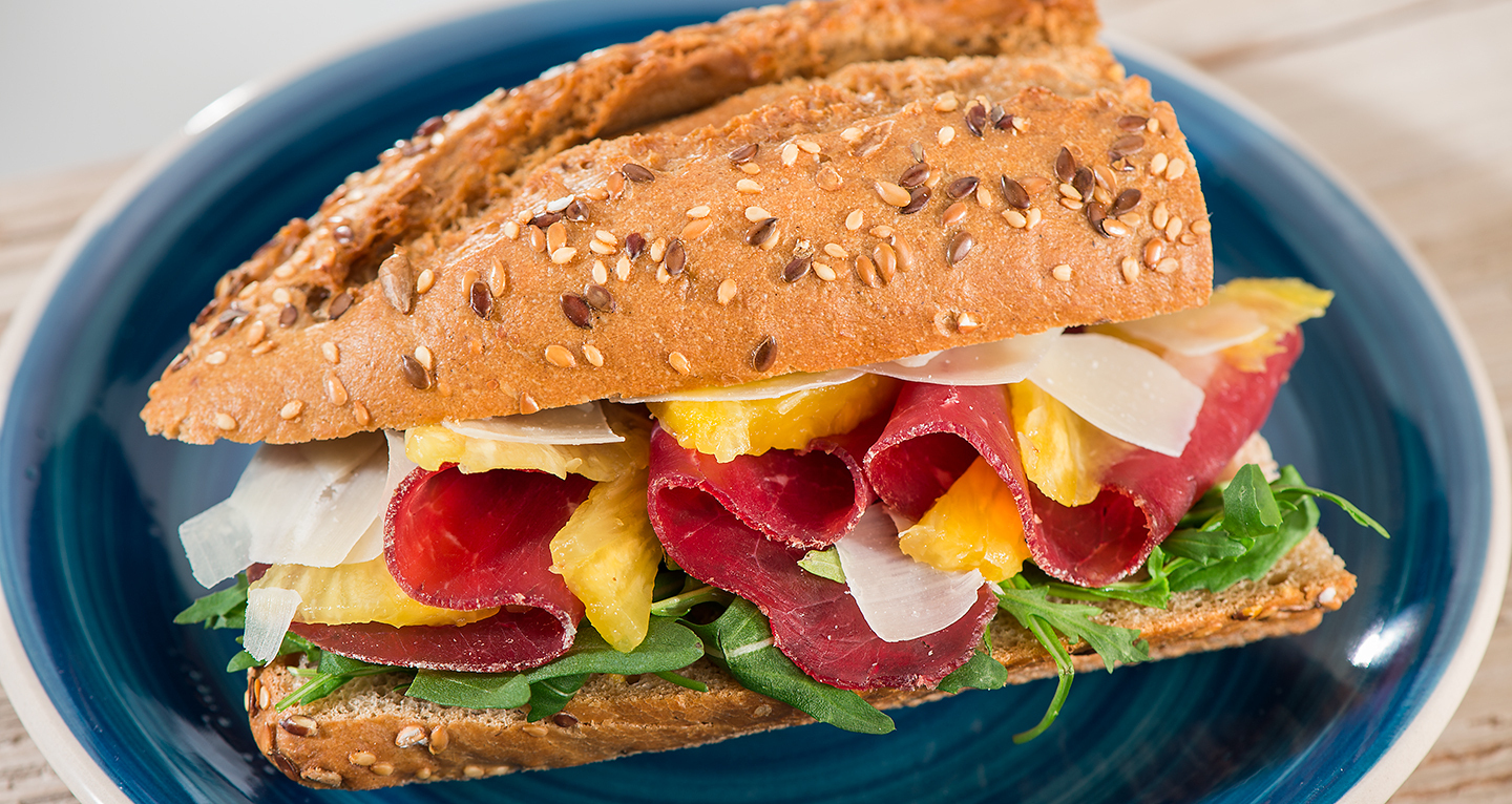 Heat the bread, cut it into two horizontally and put slices of bresaola on the lower part. Then, add the rocket, the Grana Padano cheese and the pineapple pieces. To complete, add a trickle of extra virgin olive oil.
