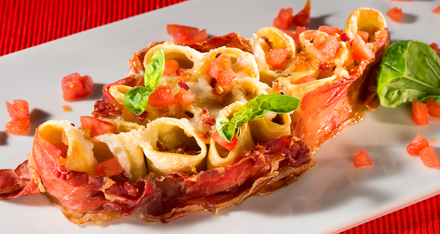 Stuffed paccheri gratin with San Daniele ham and tomato concasse
