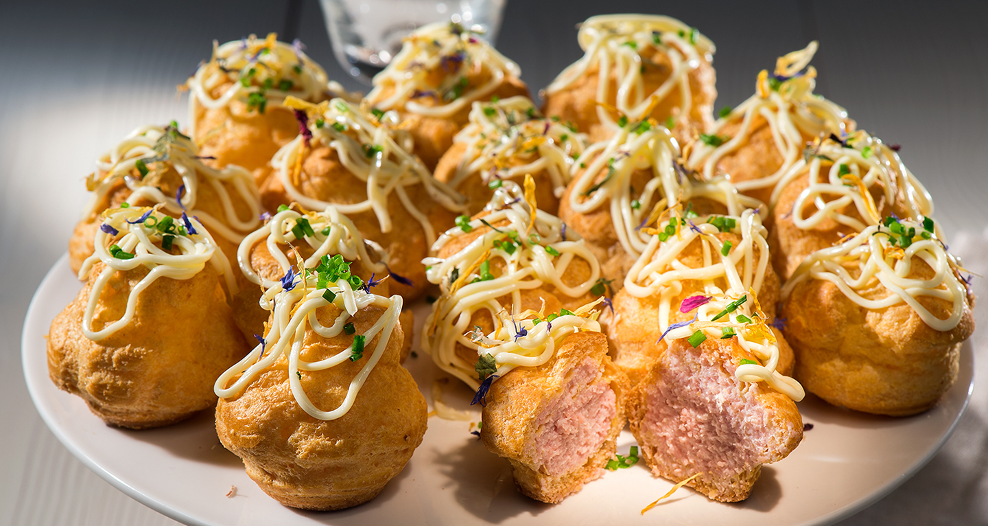 Stuffed puffs with truffle and bologna mousse, whipped butter and edible flowers
