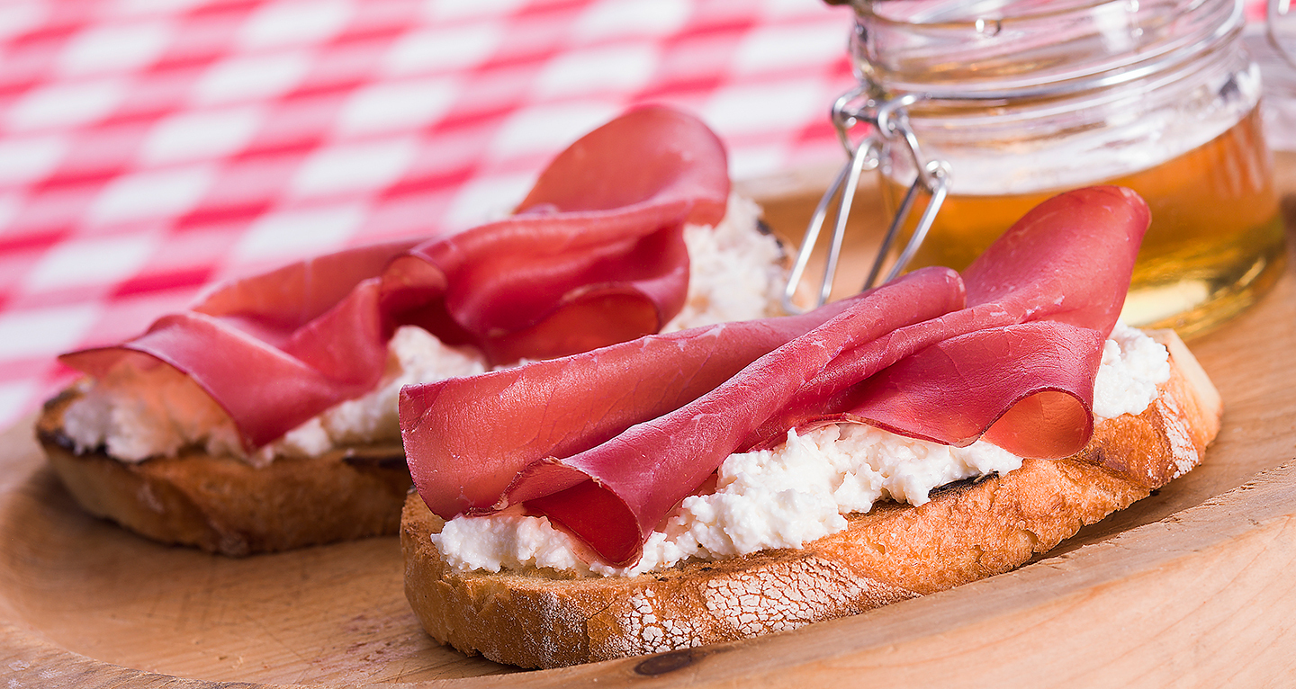 Toasted bread with honey, goat cheese, bresaola from Valtellina
